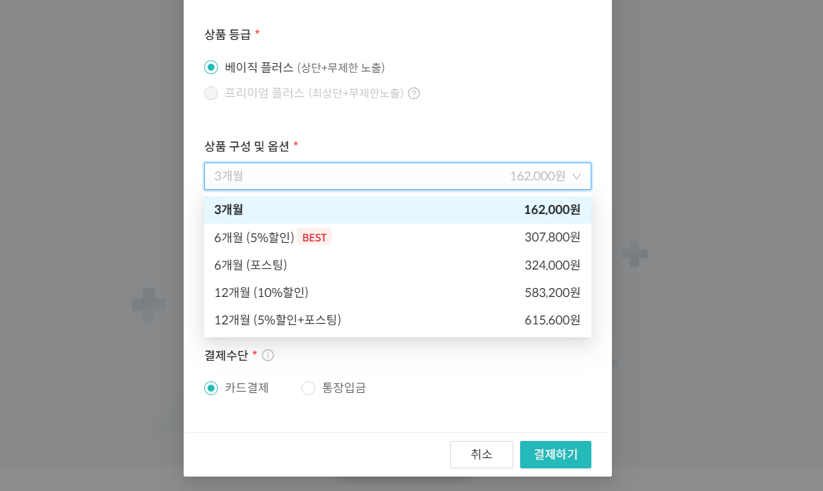 광고상품 내용을 모두 확인하셨다면, 이제 이용하실 광고상품과 결제수단을 선택해 주세요.
