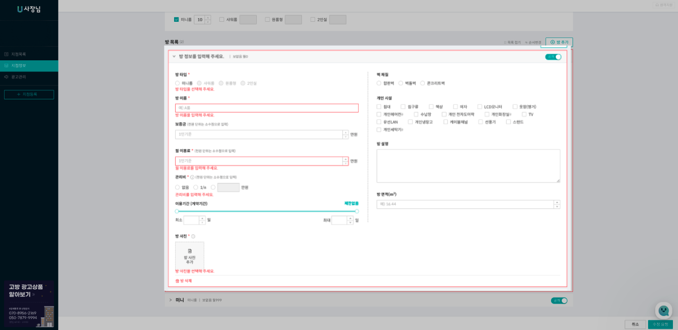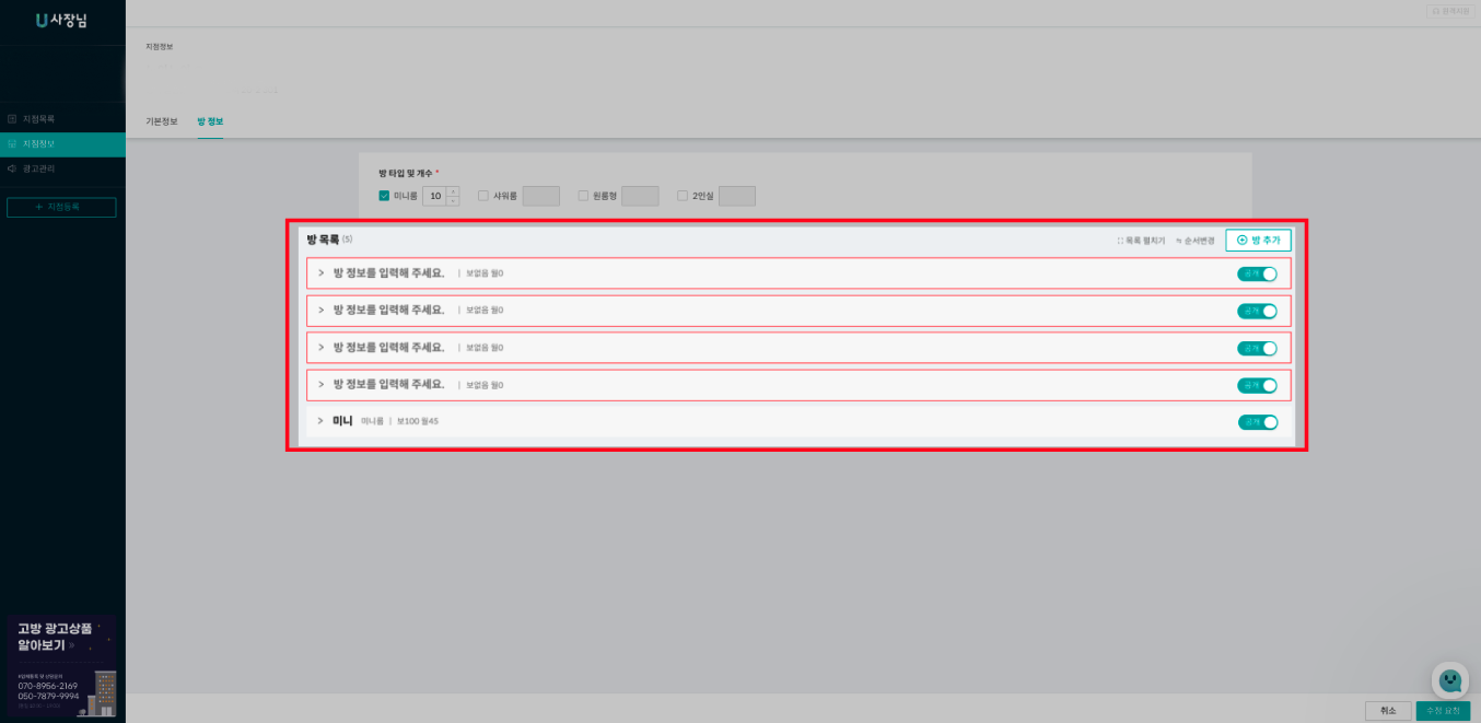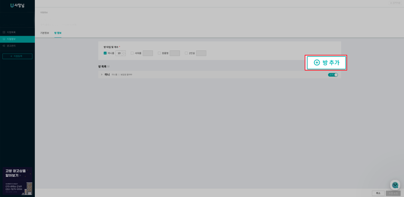 방 추가는 U사장님에서 **[지점목록] - [방 정보]**에서 진행하실 수 있습니다.