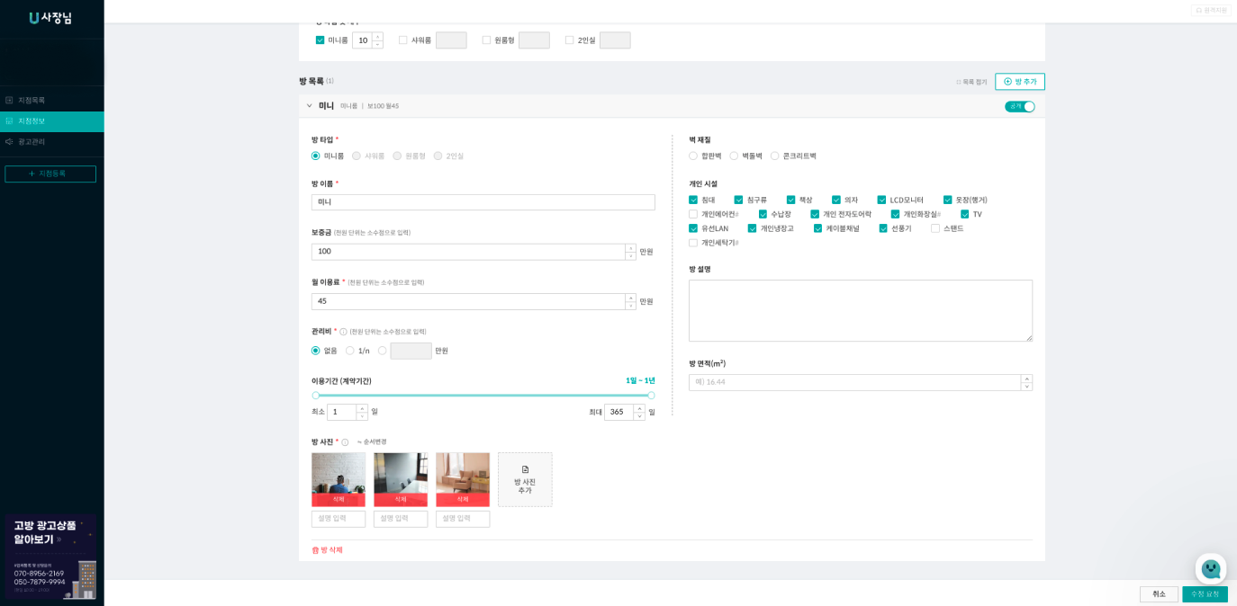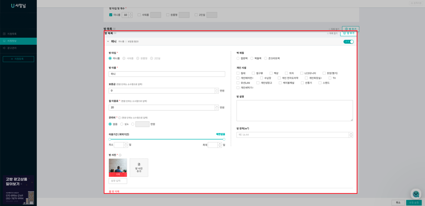 수정버튼을 클릭하시면 방 정보 하단에 아래와 같이 '+방 추가'버튼이 등장합니다. 해당 버튼을 클릭하시면 방 추가를 하실 수 있습니다.