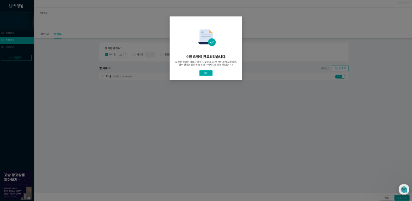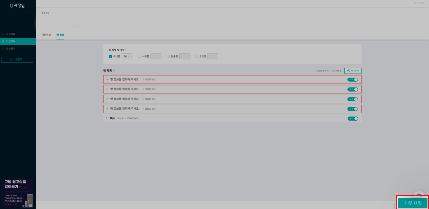 방 추가 및 입력이 모두 완료됐다면, '수정 요청'버튼을 클릭해 주세요.
