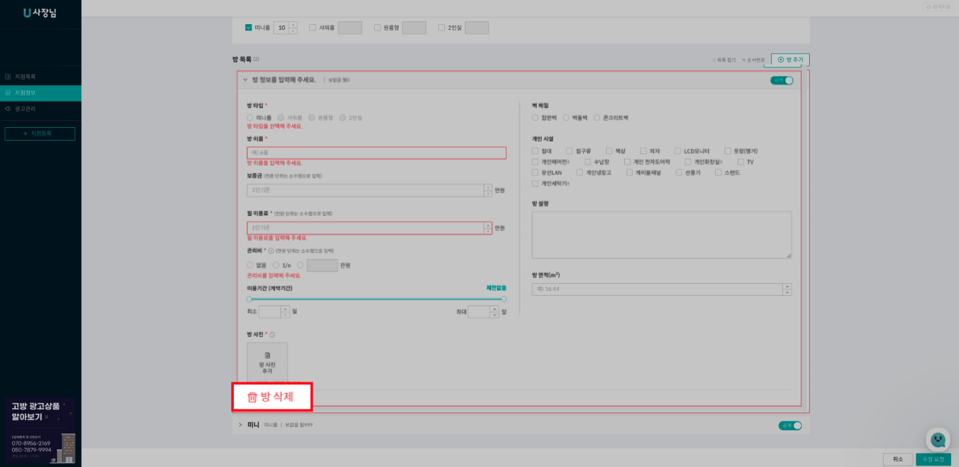 걱정하지마세요. 필수 방 정보를 모두 입력하지 않으신 경우 다음과 같이 미등록 란에 안내 문구가 활성화됩니다. 해당 란을 모두 기입할 때까지 해당 내용은 진행되지 않아요.