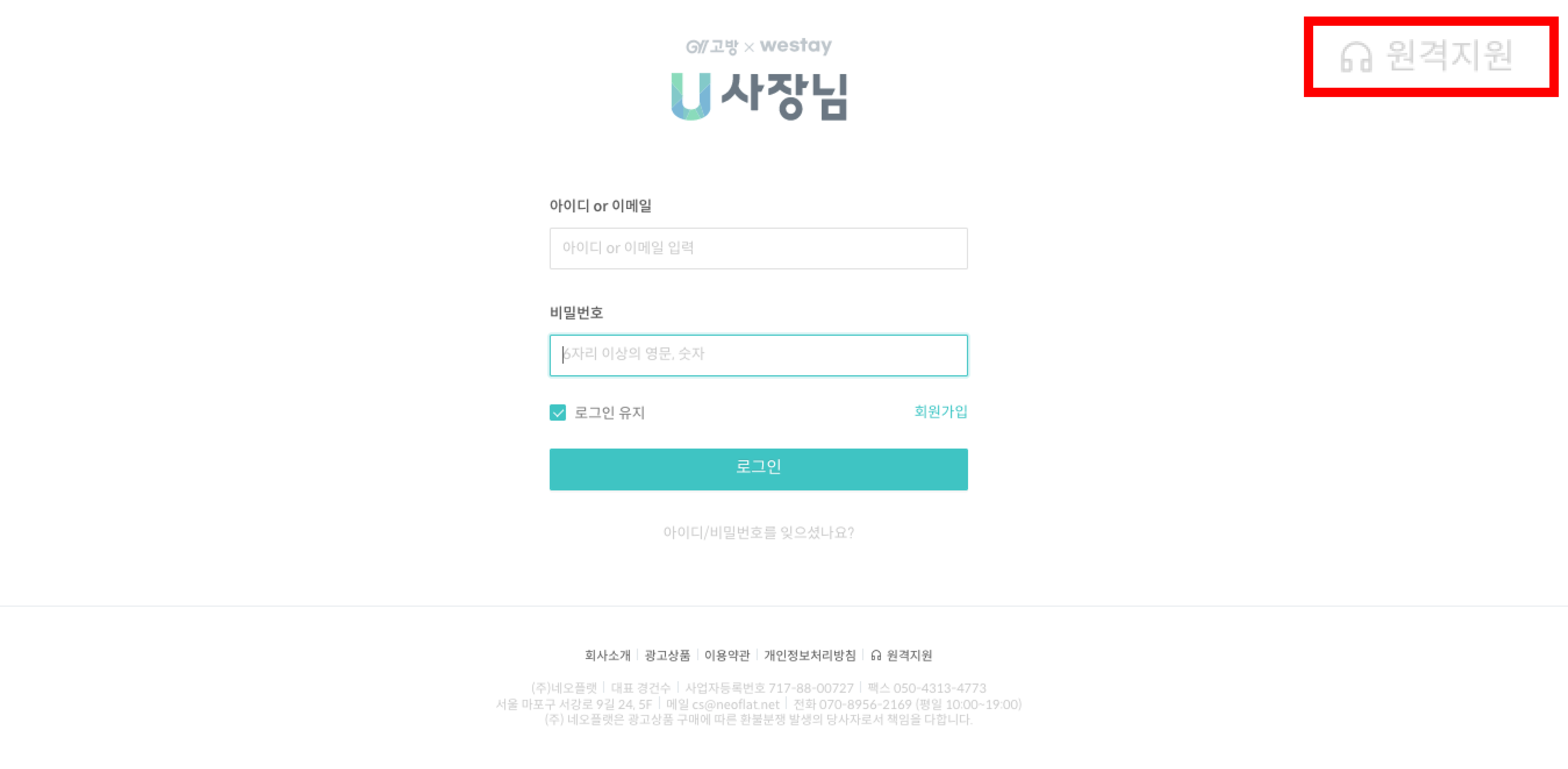 고방U사장님 로그인 페이지 우측상단에 있는 [원격지원]버튼을 클릭합니다.