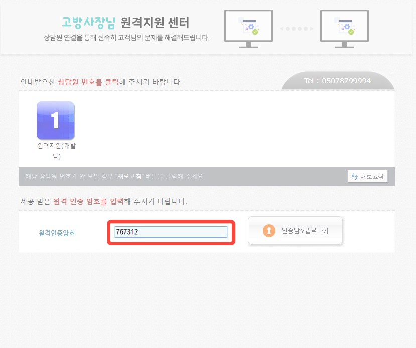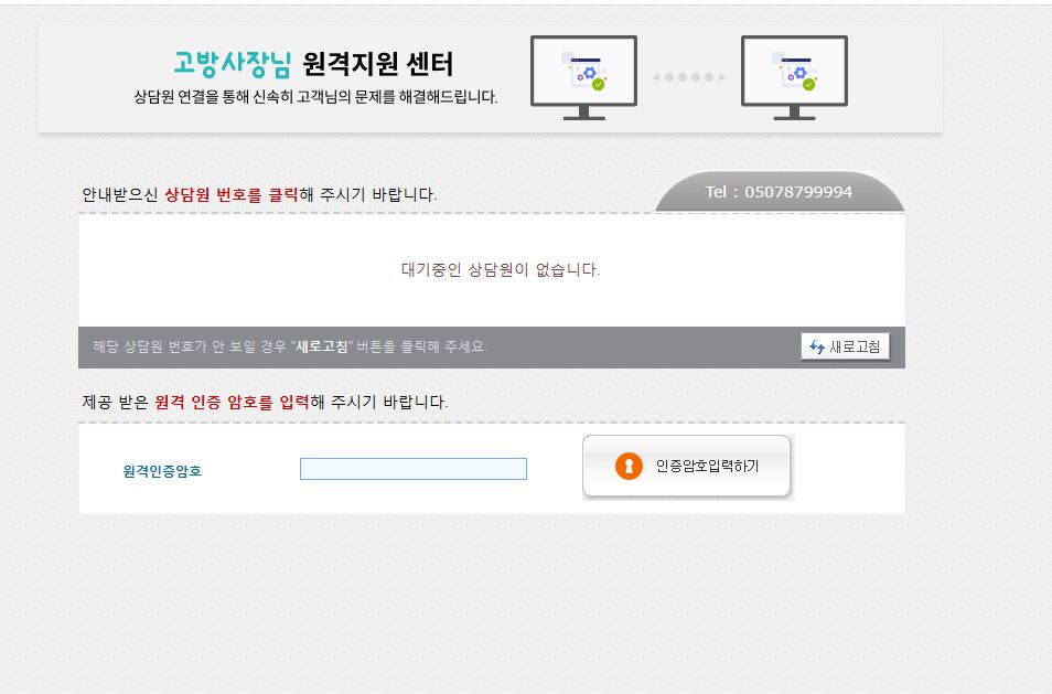원격지원암호 입력 후, [인증암호입력하기]를 클릭하면 원격지원이 시작됩니다.