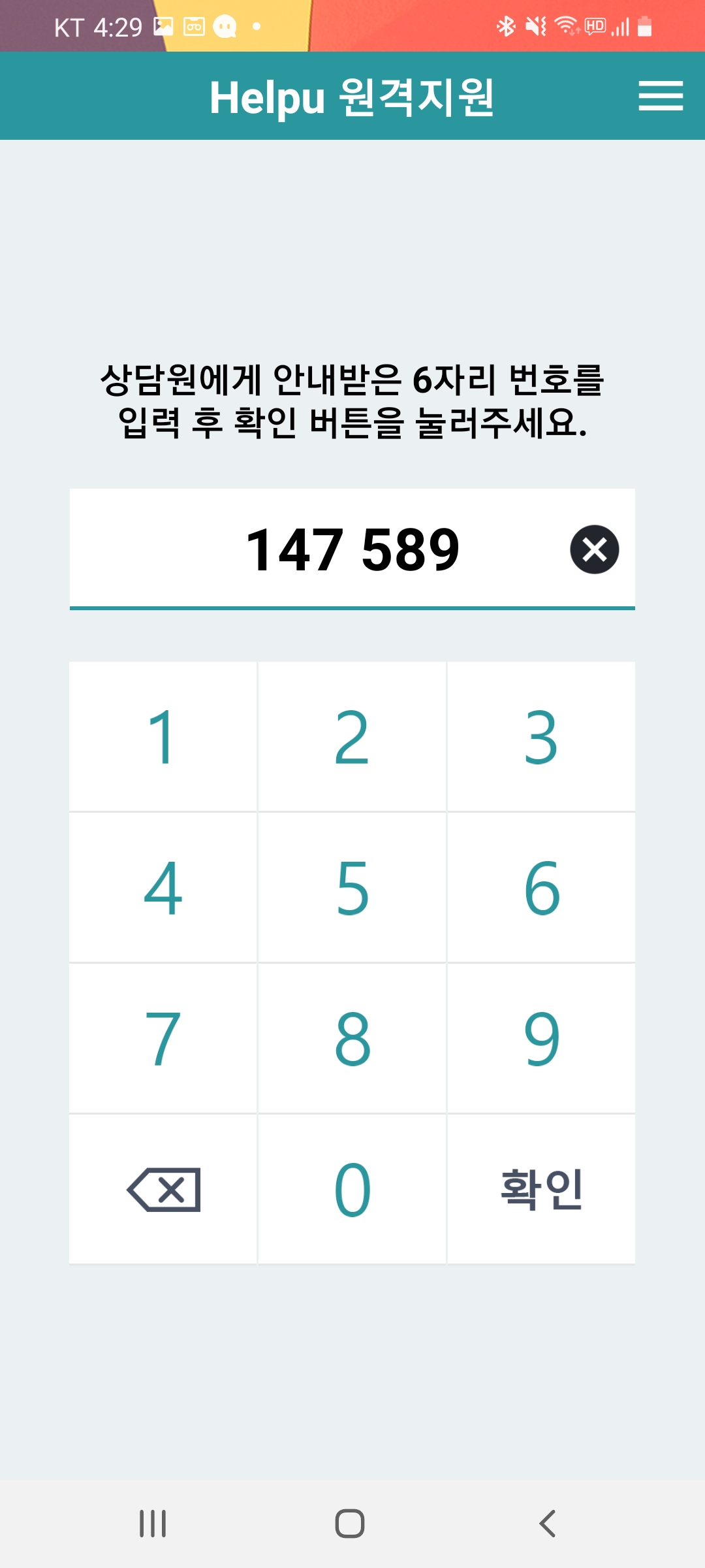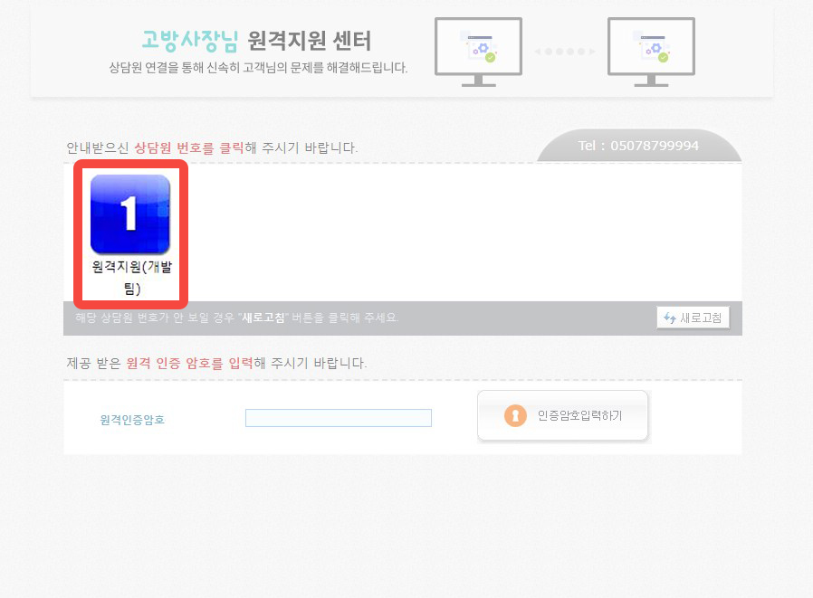 이곳에 원격지원 상담사에게 받은 원격인증암호를 입력한 후 [확인] 버튼을 누르시면 원격지원이 시작됩니다.