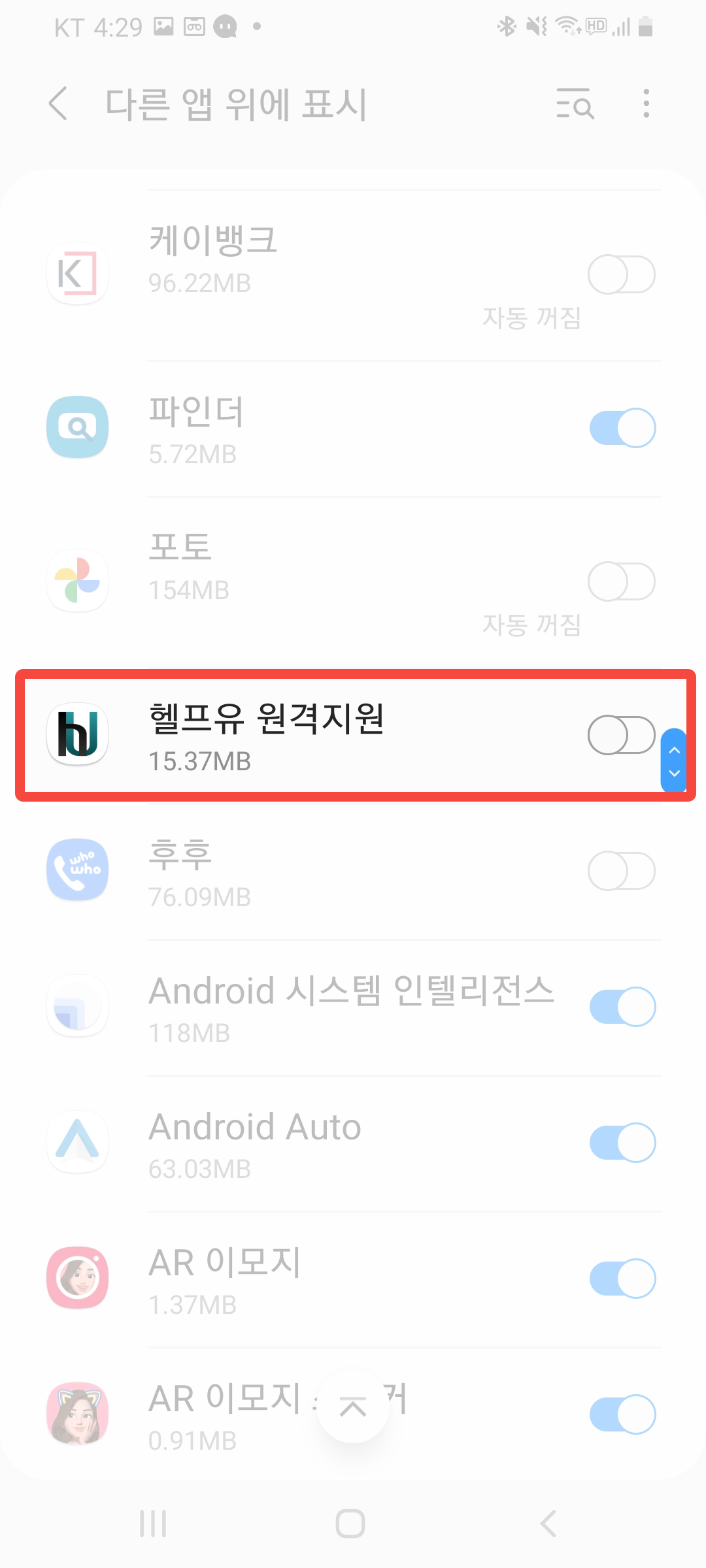 '다른 앱 위에 표시' 항목에서 [헬프유 원격지원] 탭을 찾아 우측 탭 버튼을 클릭합니다.