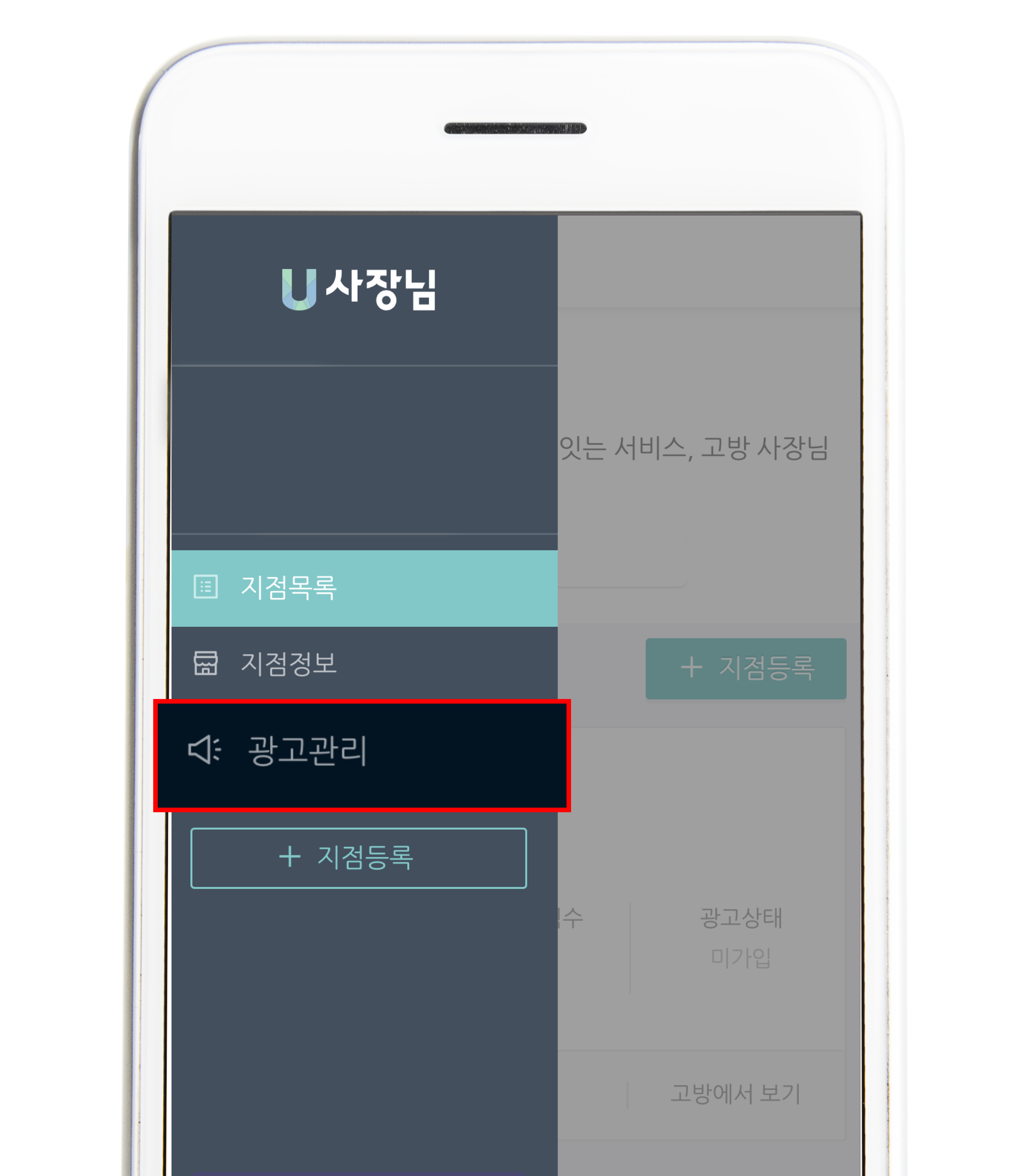 ‘햄버거 버튼’을 클릭하면 지점 관련한 목록 화면이 나옵니다. 이 중 ‘광고관리’를 클릭합니다.