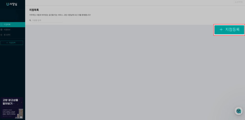'U사장님 사장님' 사이트에 접속한 후 로그인을 하면 다음과 같은 화면이 뜹니다. 화면에서 '+지점등록'버튼을 클릭하시면 지점등록을 시작할 수 있습니다.