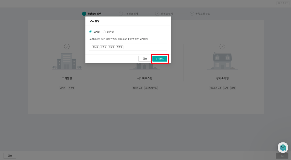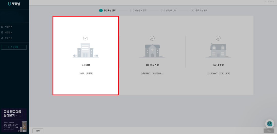 고시원(원룸텔)/쉐어하우스 중 사장님의 지점에 맞는 유형을 클릭하시고 우측 하단에 있는 '다음'버튼을 클릭해 주세요.