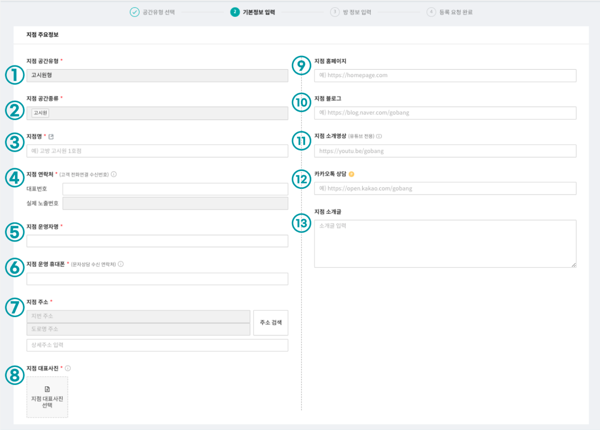 ⑦지점 주소* : 고방에 노출시킬 운영 지점의 주소를 적는 공간입니다.