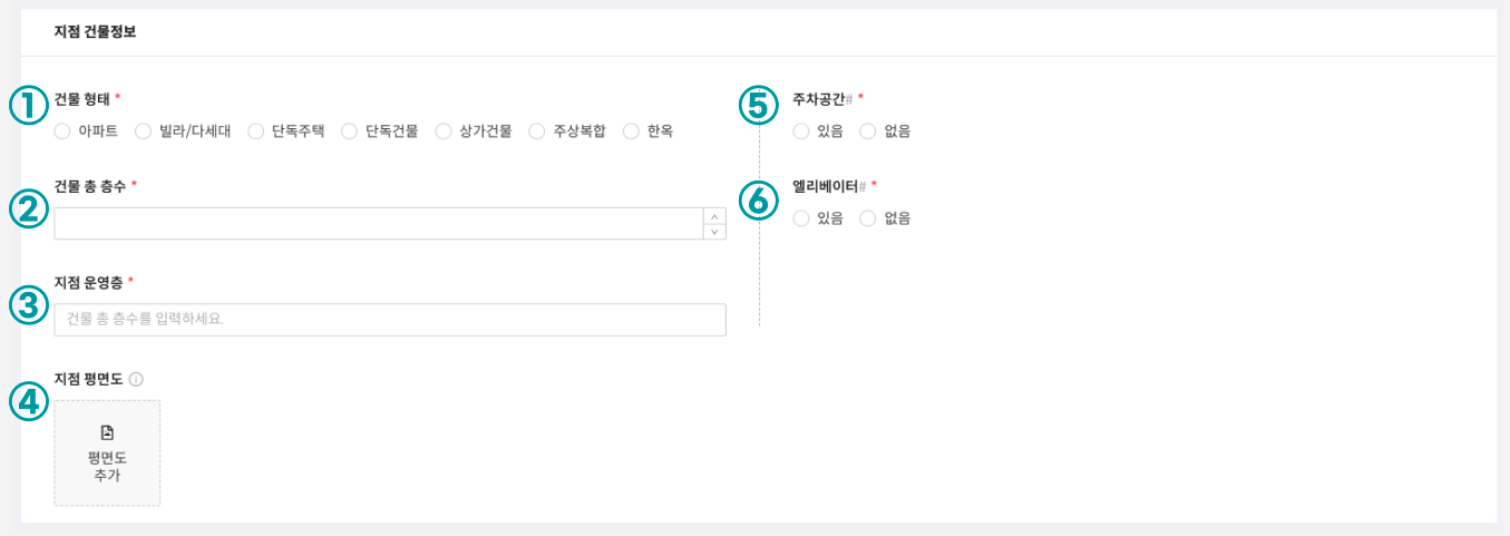 ①건물 형태* : 운영지점의 건물 형태를 선택하는 공간입니다.