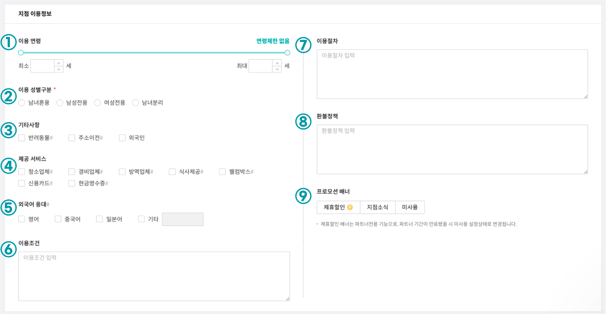 ⑨프로모션 배너 : 고객들에게 알리고 싶은 지점 소식 및 고객들에게 제공할 제휴할인(이벤트)를 기입하는 공간입니다.