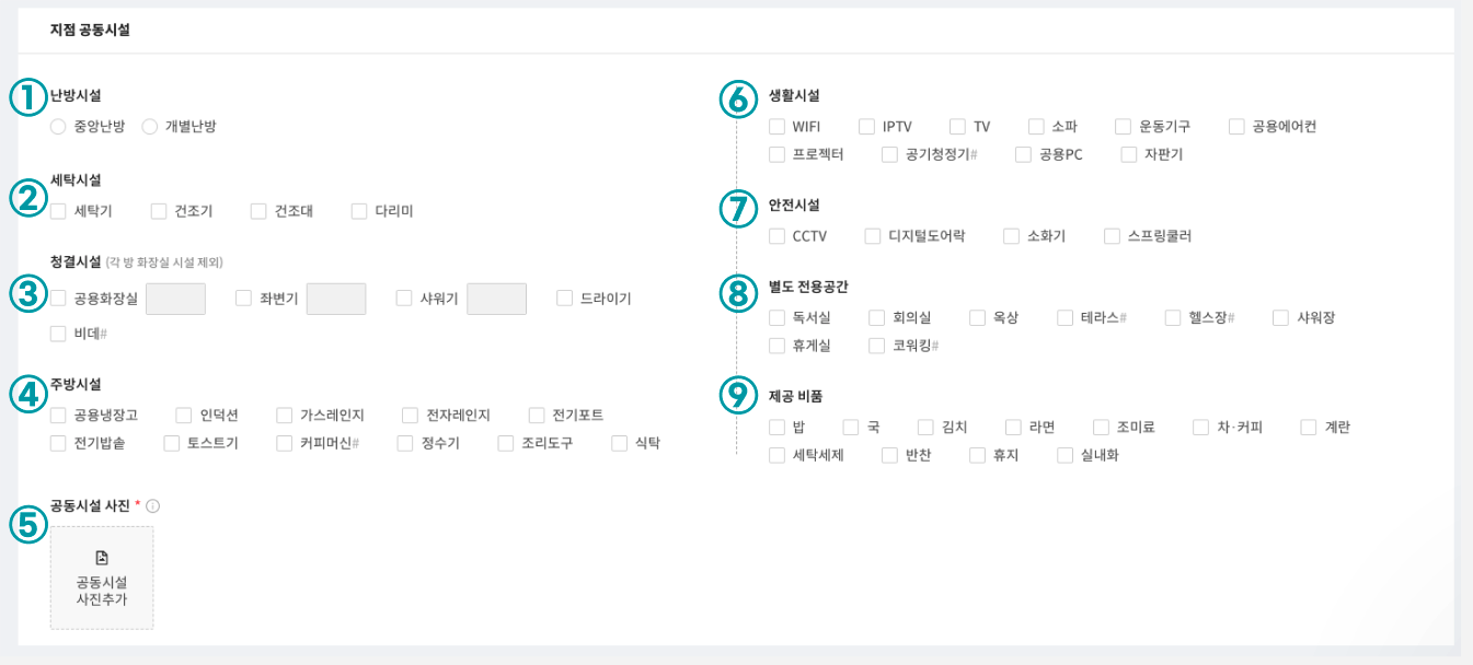 ⑥생활시설 : 공용공간에 구비된 생활시설을 알려주는 공간입니다. (공용시설이 아닌, 각 방에 TV가 있다면 선택해서는 안돼요!)