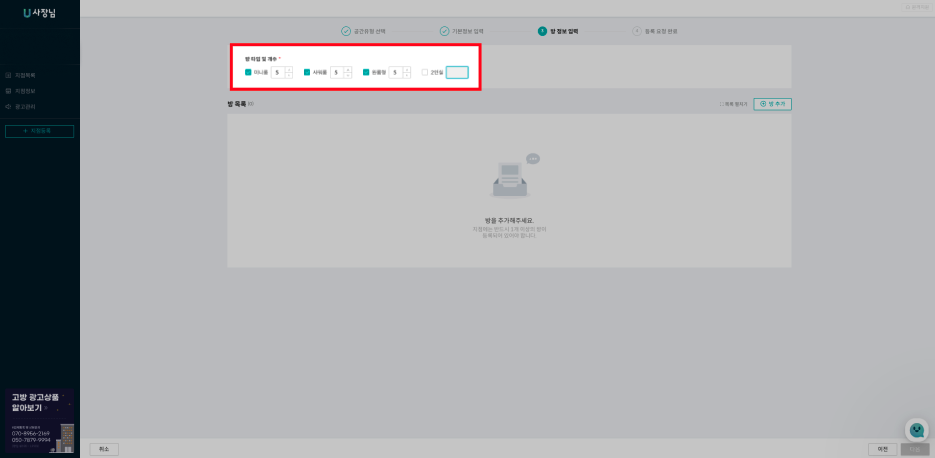 지점의 기본정보를 모두 입력하셨다면 이제 지점의 방 정보를 입력할 차례입니다. 고객이 직접 살아야 하는 공간인만큼 구체적인 정보를 담는 것이 중요합니다.