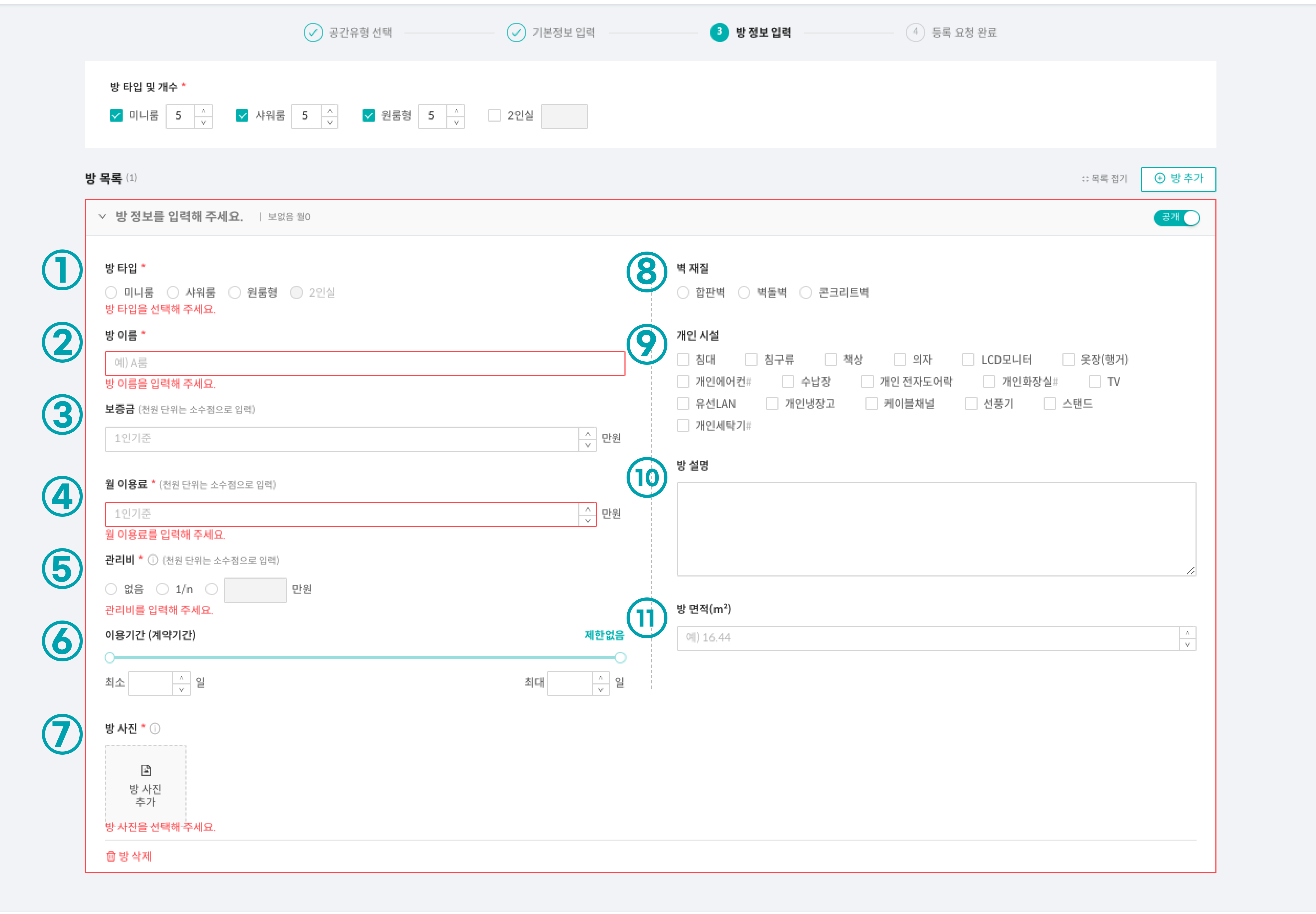 화면 상단에 있는 '방 타입 및 개수'를 등록해주세요.