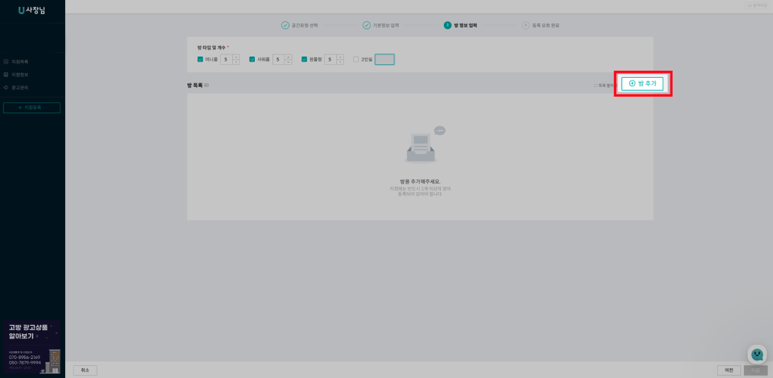 사장님에 따라 다양한 방을 가진 사장님도 계실 겁니다. 방을 추가하고 싶으시다면 방 정보 입력 페이지 우측 상단에 '+ 방 추가'버튼을 클릭해 주세요.