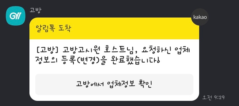 등록한 정보는 담당자 검수 후, 아무 문제가 없을 시 영업일 기준으로 1~2일 이내에 서비스 노출 됩니다. 검수 결과는 '고방 알림톡' 또는 '문제 메시지'로 받으실 수 있습니다.