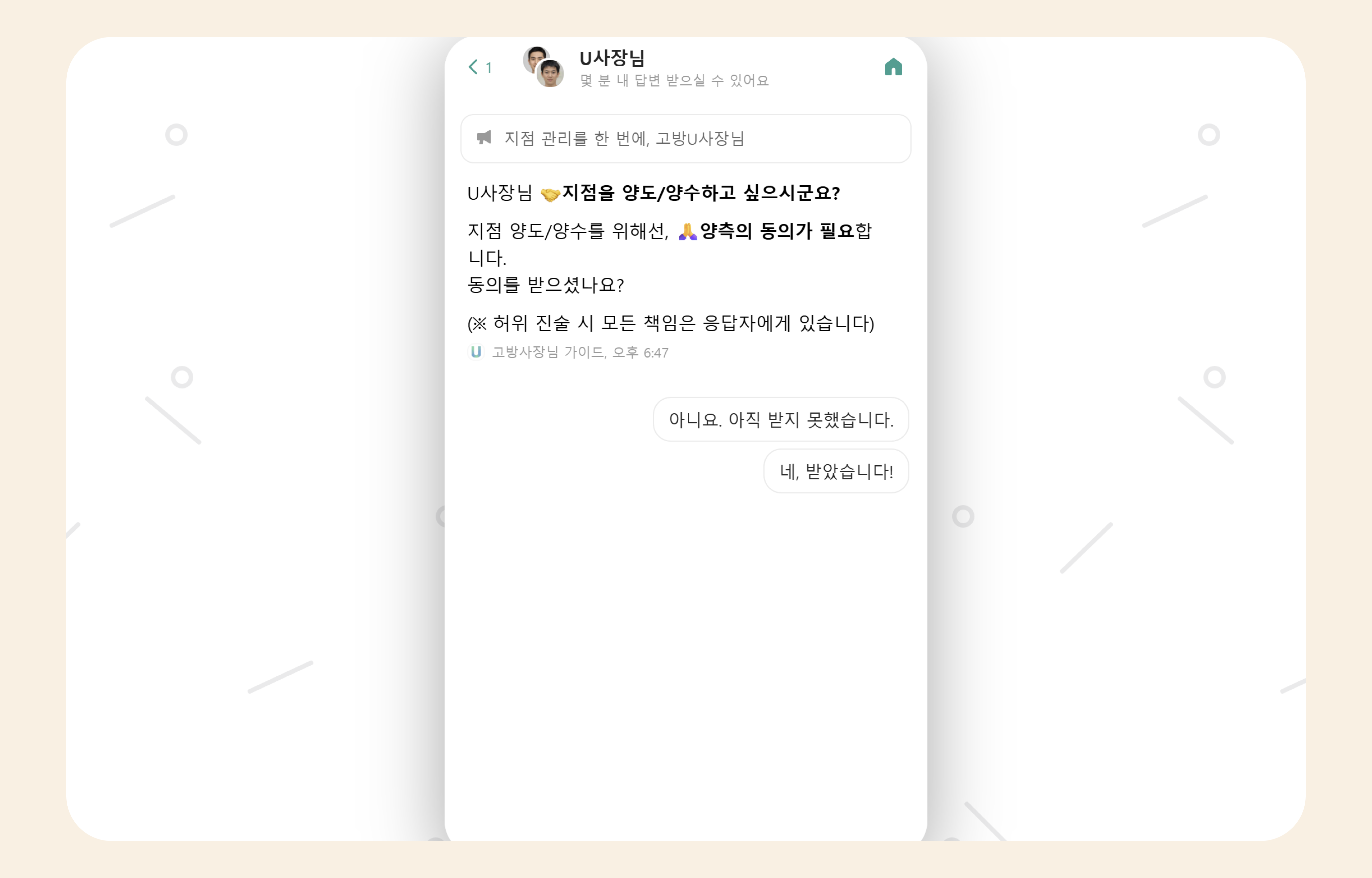 양수를 받는 사장님이 아직 U사장님 회원이 아닌 경우 양도 · 양수를 진행할 수 없습니다.