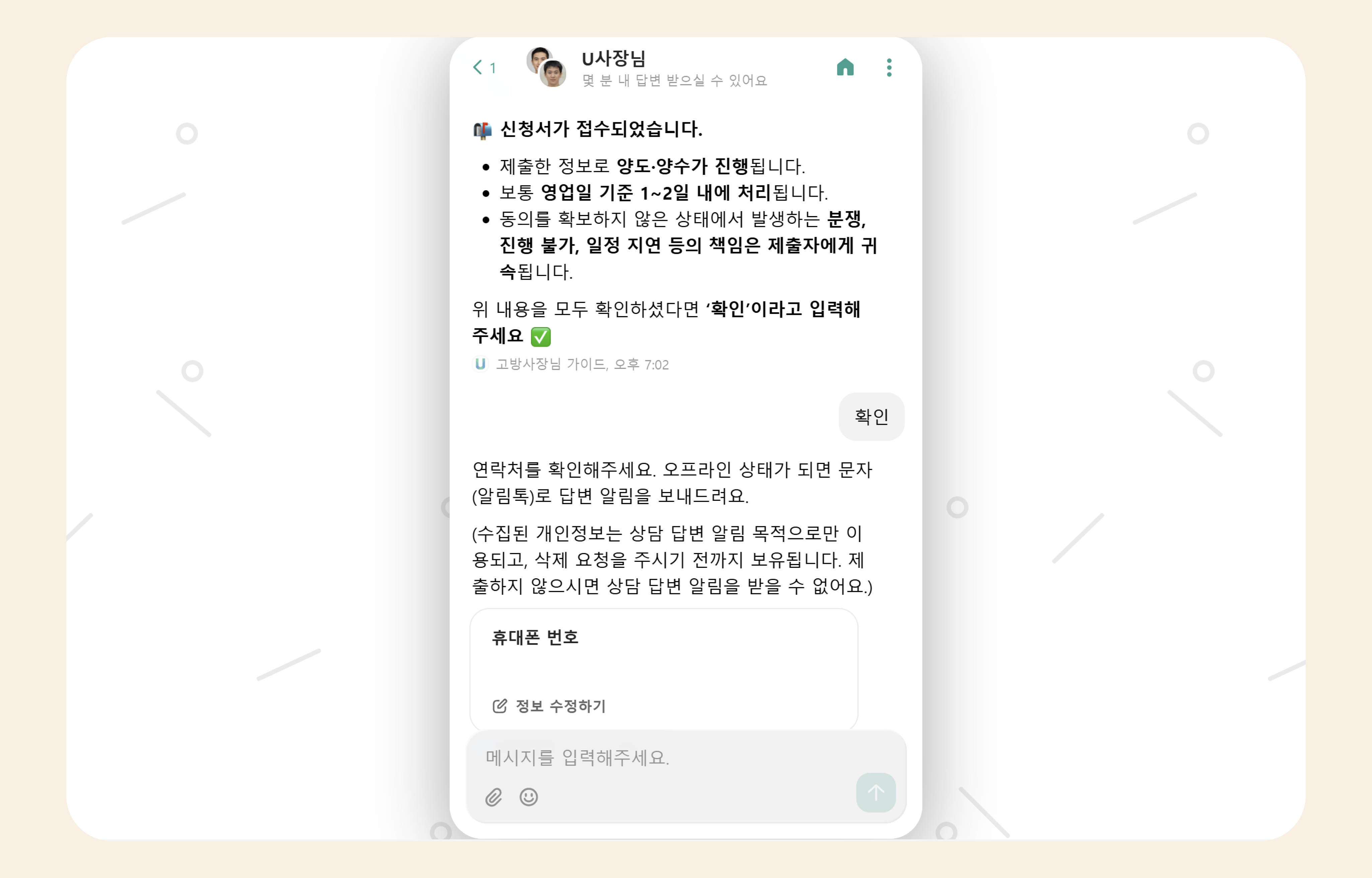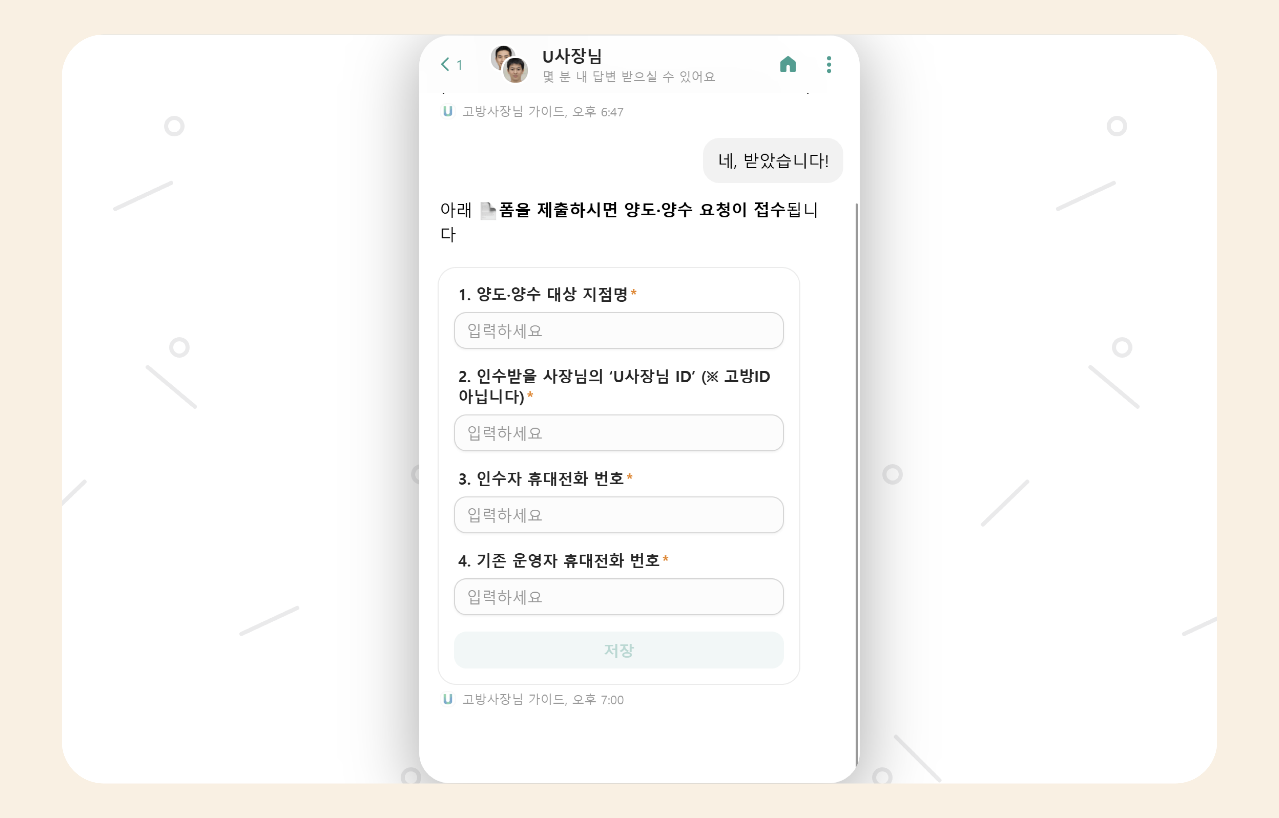 U사장님은 서비스 품질 유지와 분쟁 방지를 위해 자동 사업주 변경 기능을 제공하지 않으며, 담당자 확인 후 수동으로 처리하고 있습니다.