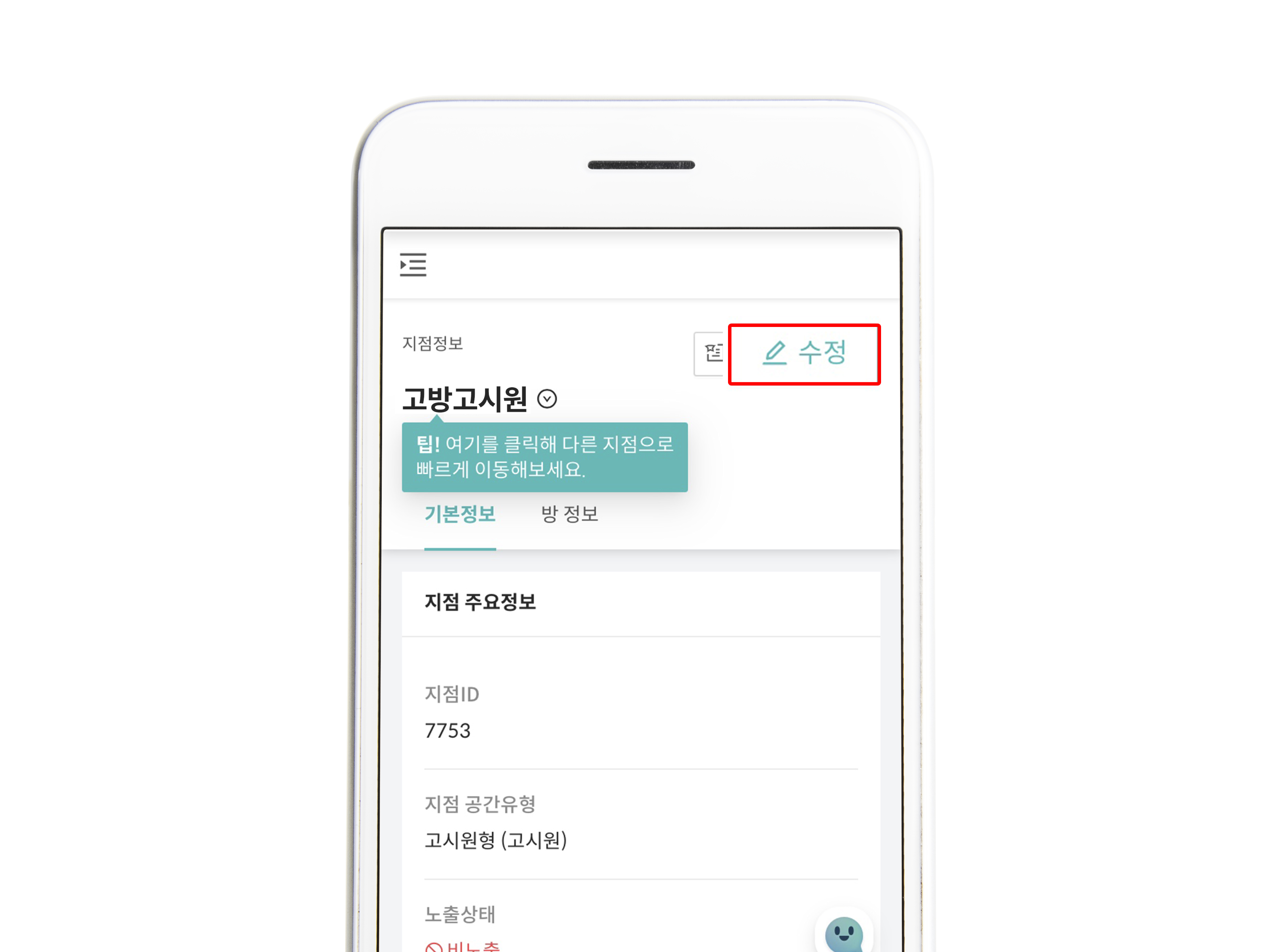 기본정보 클릭 후 나오는 지점정보 화면에서, 지점 정보 수정을 위해 우측 상단에 있는 ‘수정’ 버튼을 클릭합니다.