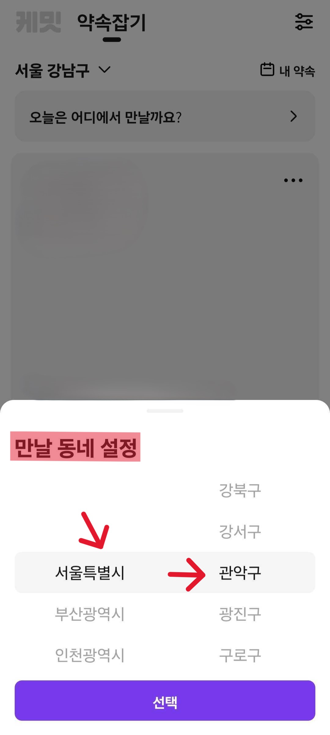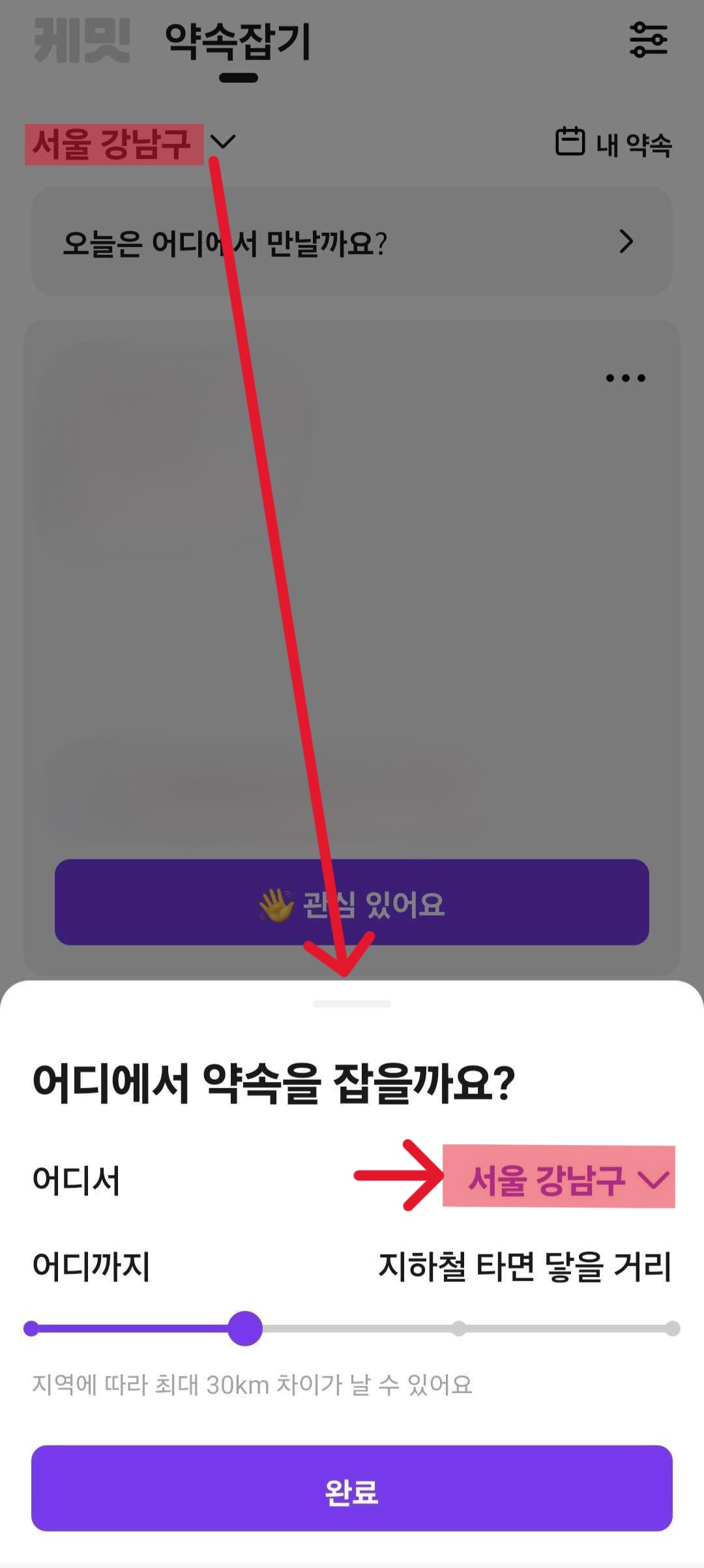 4. 약속은 상대 회원과 만남을 원하는 동네를 선택할 수 있고 아래 방법으로 동네와 거리는 직접 수정할 수 있어요.