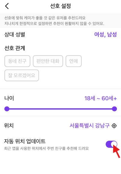 ✔️단, 해당 기능을 OFF 하는 경우, 최근 앱을 사용한 위치에서 주변 친구를 소개받을 수 없고, 맞춤 추천(동네 친구 추천)이 정확하지 않을 수 있어요.
