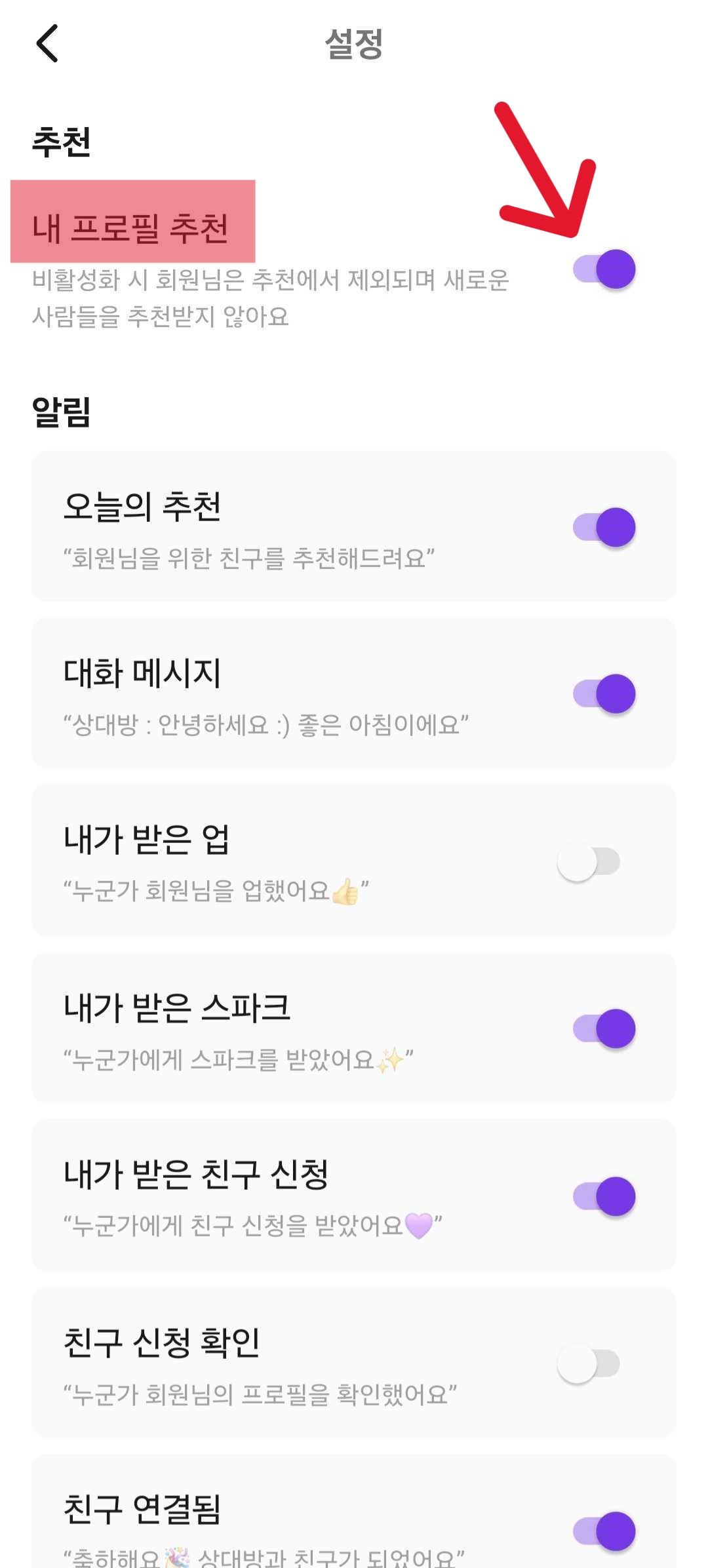 추천 → 내 프로필 추천을 비활성화(ON/OFF)합니다.