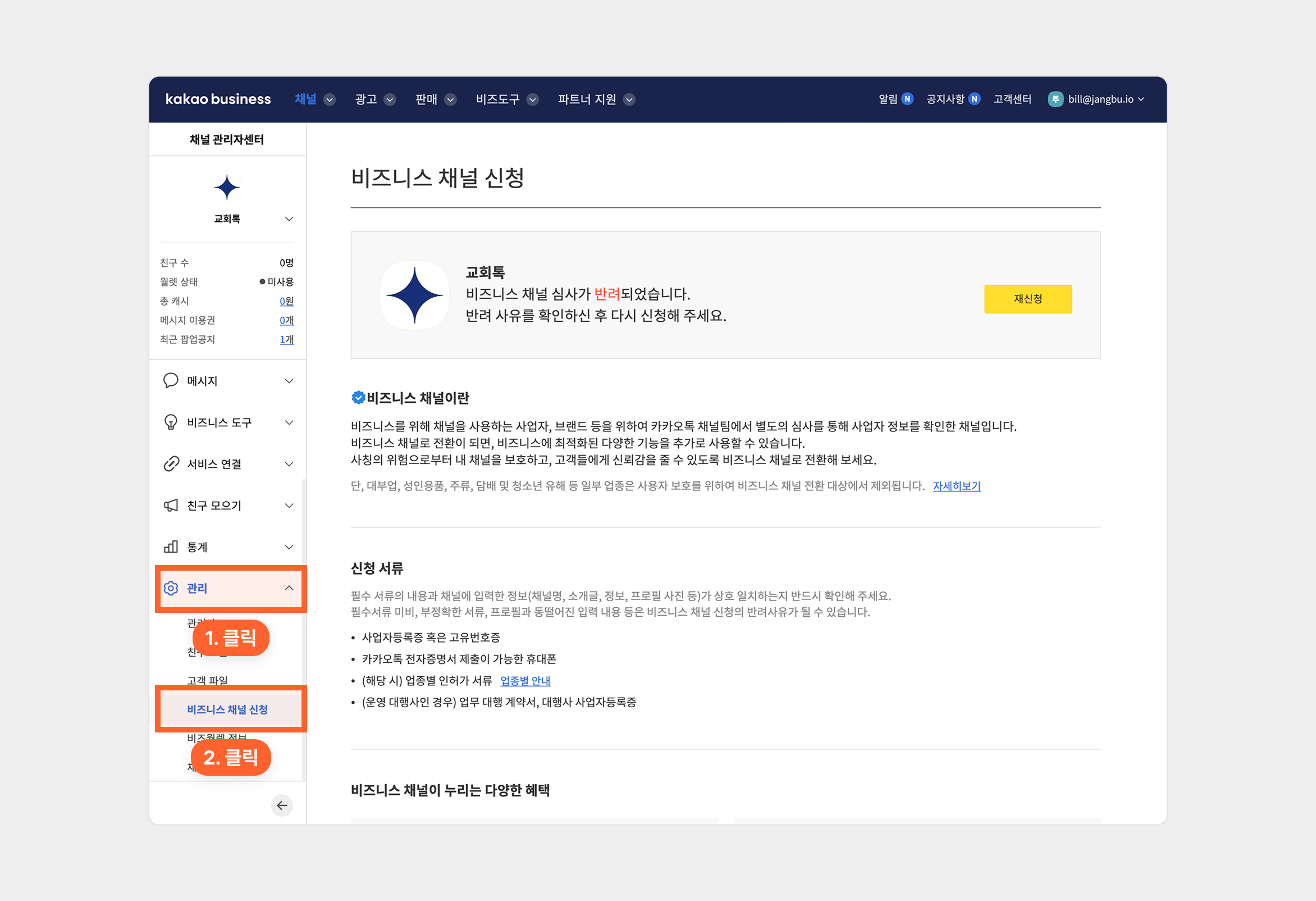 [비즈니스 채널 신청]메뉴 클릭신청후 승인까지 1~3일 소요됩니다