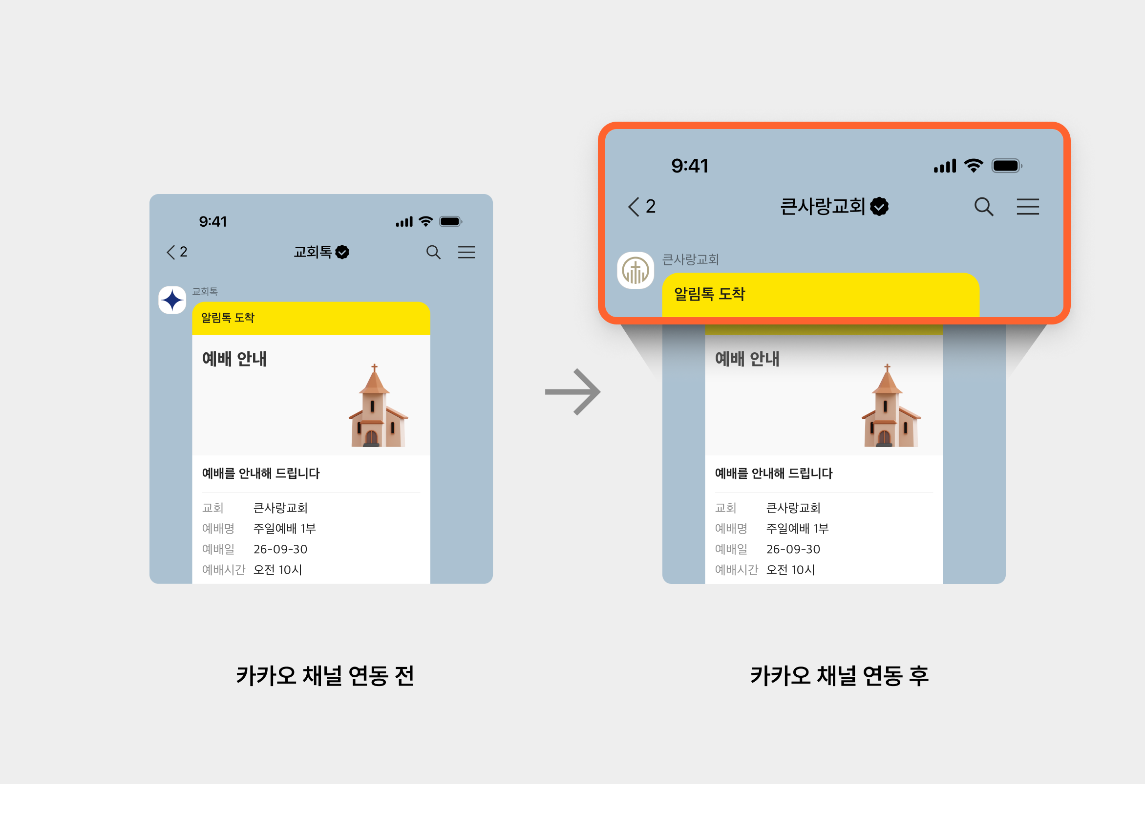 (카카오 채널을 연동하지 않으면 '교회톡' 계정으로 메시지가 발송돼요.)
