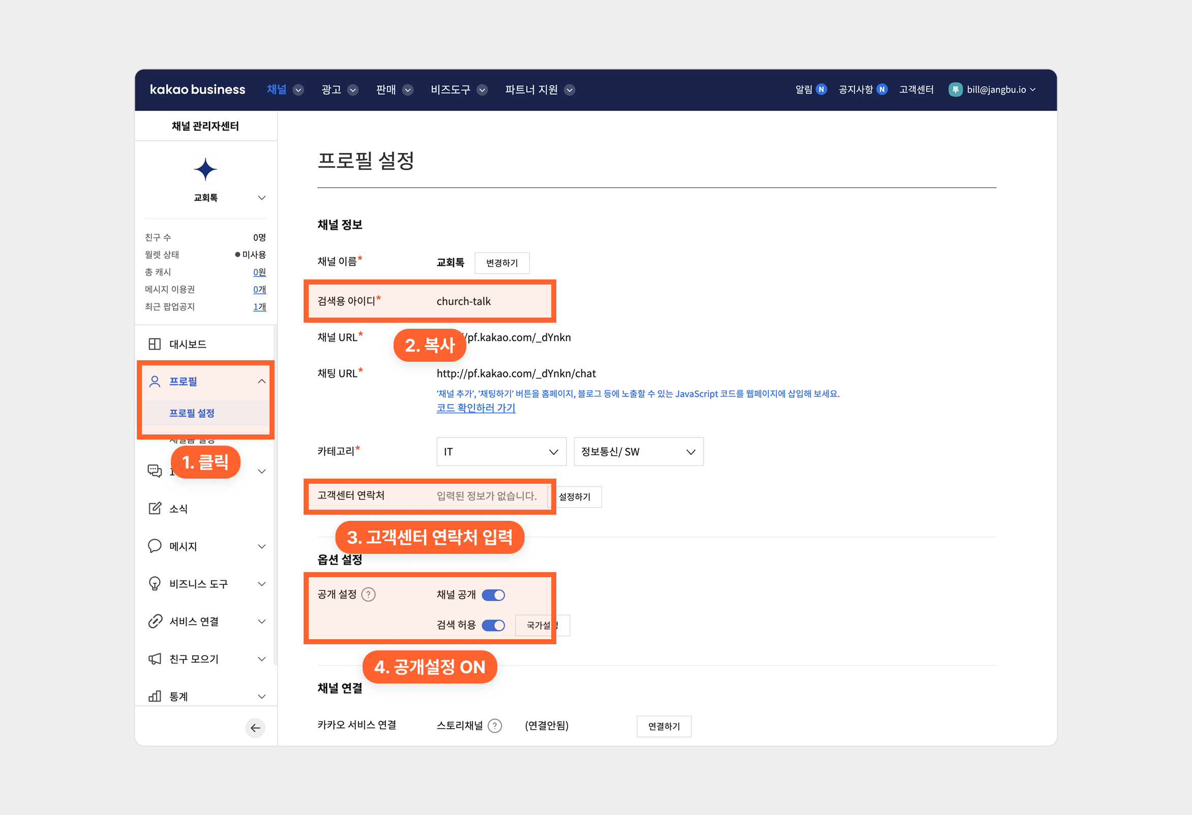 [검색용 아이디]를 포함하여 아래 정보를 교회톡 고객센터에 전달문의/메일 제목: 카카오 채널 연동