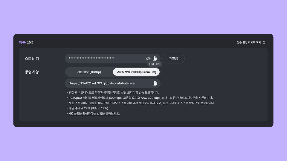 1080p Premium 모드는 스트리머가 송출한 비디오와 오디오 소스를 서버에서 재인코딩하지 않고, 원본 그대로 패스스루 방식으로 전송합니다. 이를 통해 게임 방송, 음악 방송, 버추얼 공연 등 고품질 콘텐츠에서 더욱 선명한 화질과 원본에 가까운 음질을 경험할 수 있습니다.