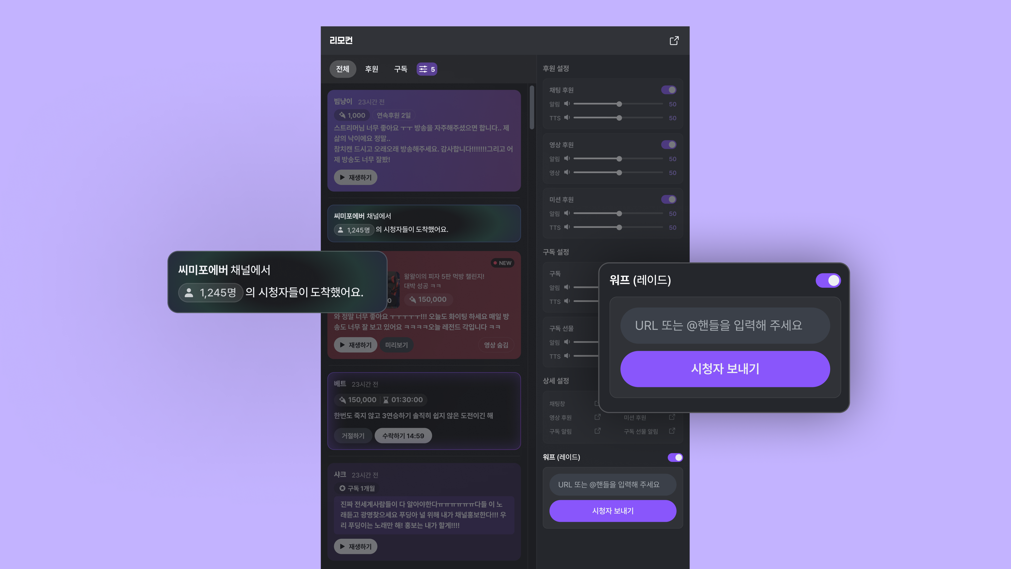 워프가 시작되면 오버레이에 워프 효과가 나오며, 어떤 채널에서 몇 명의 시청자가 워프 준비 중인지 표시됩니다.