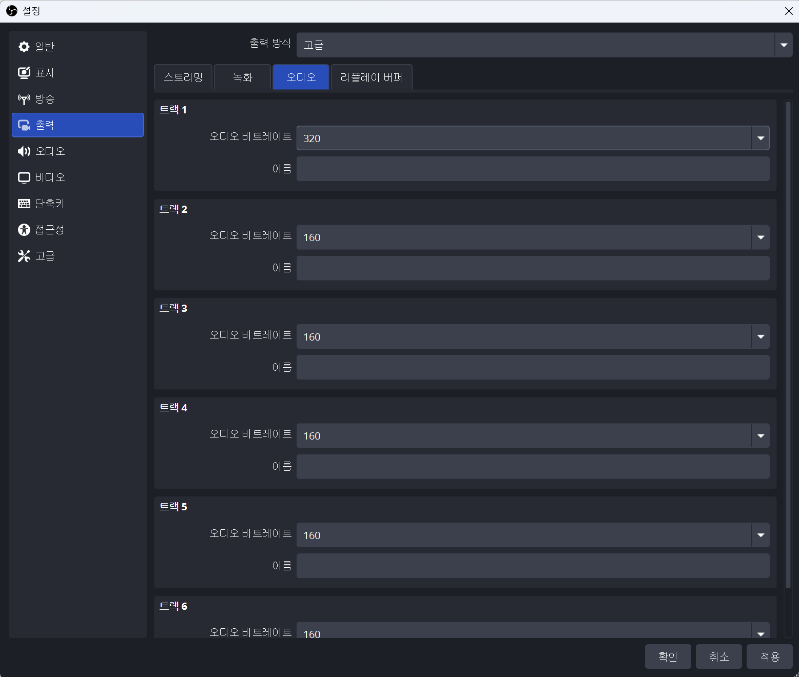 OBS [설정] → [출력]에서 출력 방식을 고급으로 변경한 후 다음과 같이 설정합니다.