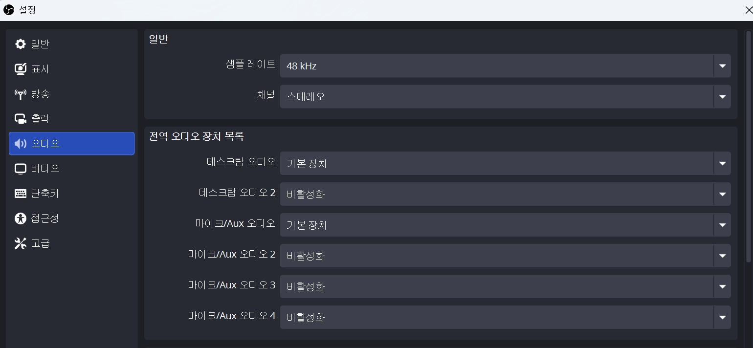 OBS [설정] → [오디오]에서 다음과 같이 설정합니다.