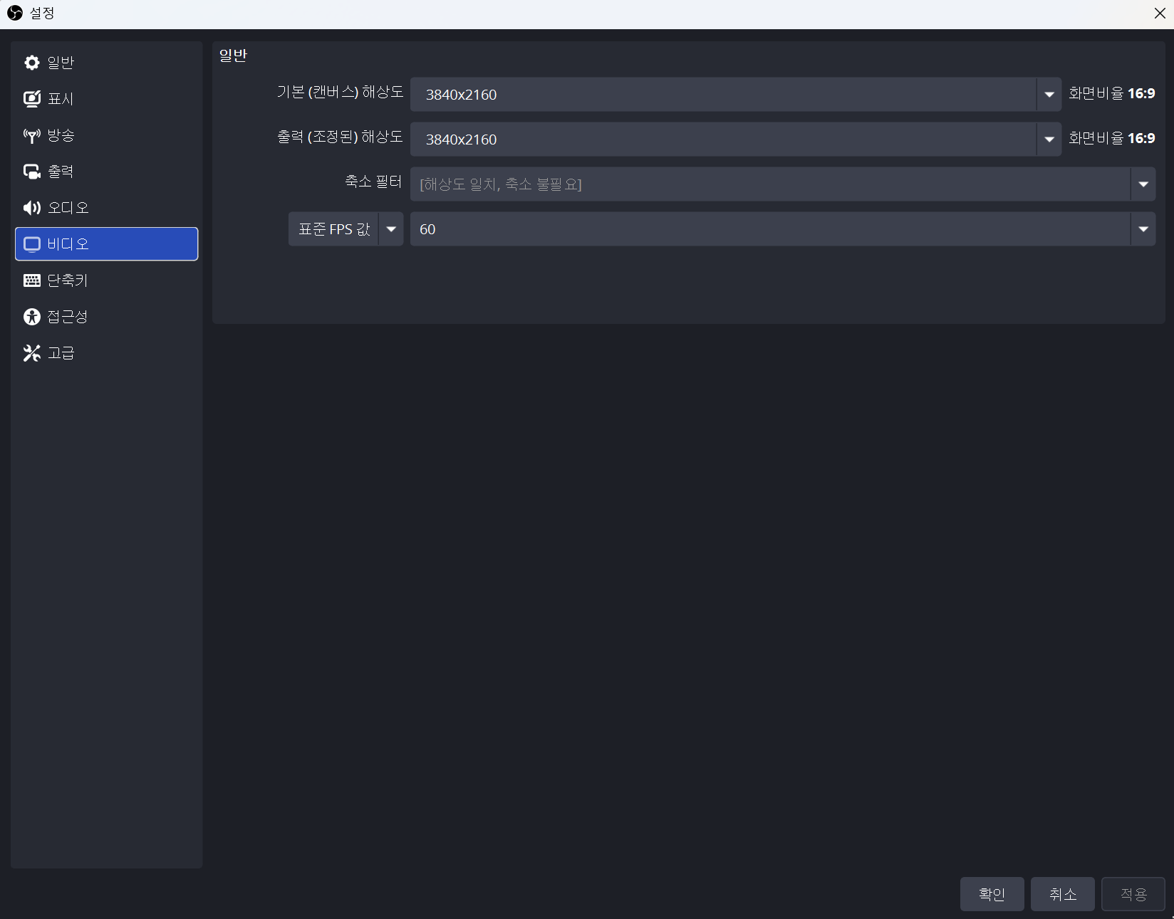 OBS [설정] → [비디오]에서 다음과 같이 설정합니다.