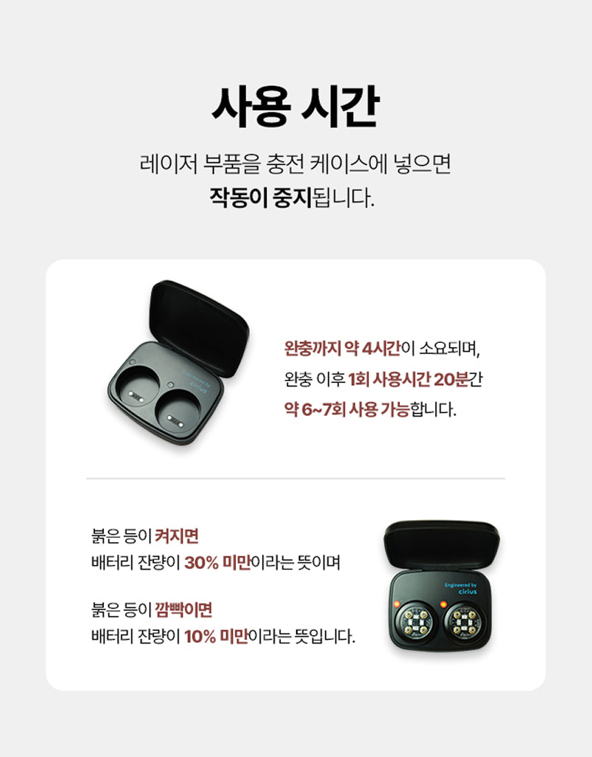 케이스를 충전하는 동안에는 레이저 모듈은 충전이 되지 않아요. 레이저 모듈 충전을 원하시는 경우 케이스에 충전 케이블을 연결하지 않은 상태에서 레이저 모듈을 케이스에 넣어주세요.
