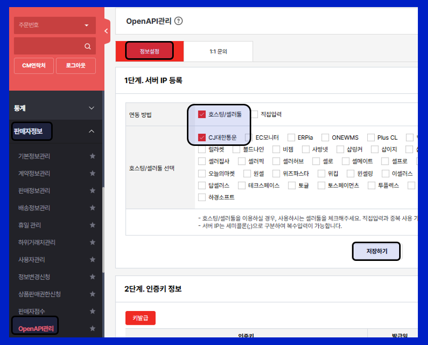 1단계. 서버 IP 등록에서 '호스팅/셀러툴'와 'CJ대한통운' 체크 및 저장하기 버튼 클릭합니다.