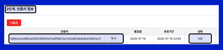 2단계. 인증키 정보에서 상태 '사용'의 인증키를 영업사원에게 전달합니다.