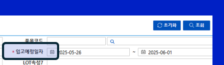 입고 실적 현황을 조회하는 화면으로, 등록하신 입고 예정일자를 확인 후 조회하세요.