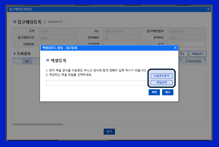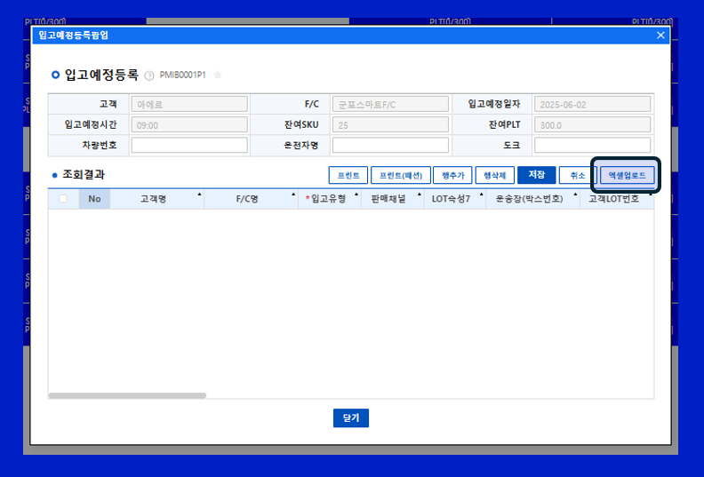 경로 : eFLEXs 입고/반품관리 입고 입고등록 고객 ID 확인 후 조회 클릭