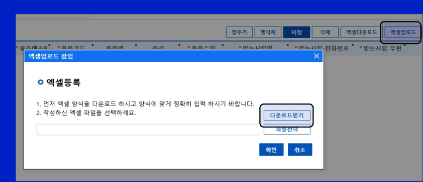 '엑셀업로드 버튼' 클릭 후, '다운로드받기 버튼' 클릭하여 양식을 다운로드 합니다.