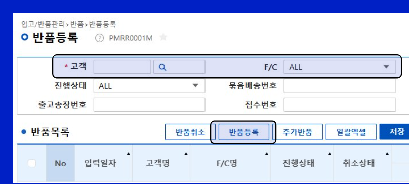 '고객ID'와 'F/C' 선택 후, '반품등록 버튼'을 클릭합니다.