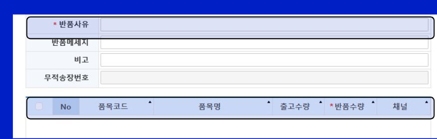 조회 후, 자동반영된 정보 확인 반품 사유 입력 반품 품목을 체크합니다.