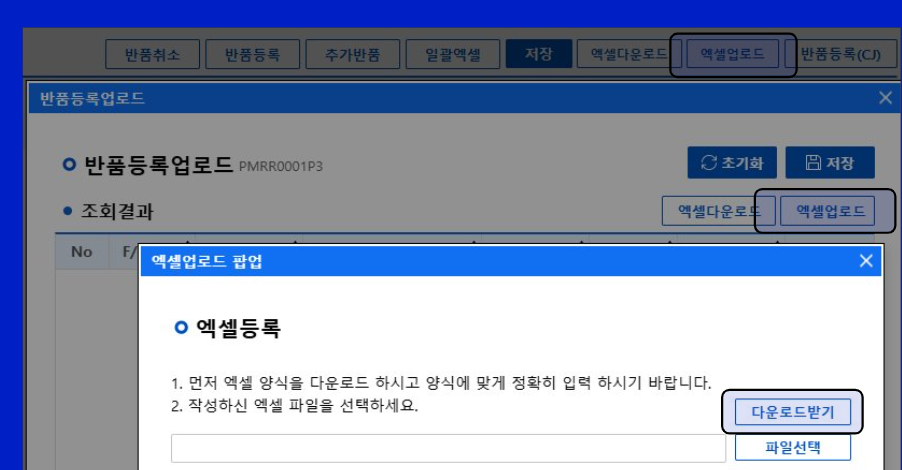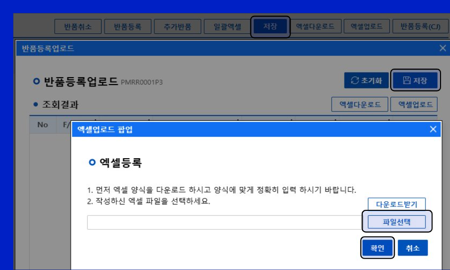 반품등록업로드의 '저장 버튼' 반품등록의 '저장 버튼'을 클릭합니다.