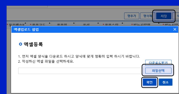 마지막으로 엑셀업로드 팝업의 파일선택 (2. 파일) '확인 버튼' '저장 버튼'을 클릭합니다.