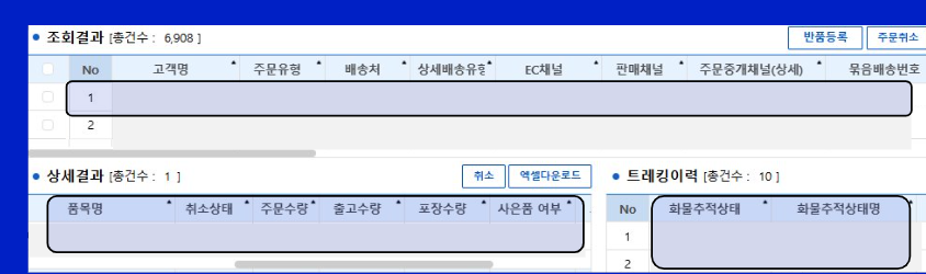 상세결과는 주문 / 출고 / 포장 수량, 사은품여부 등을 확인할 수 있습니다.