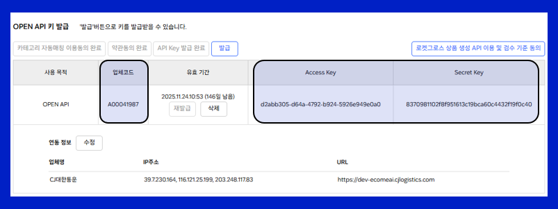 ※ 재발급 된 업체코드, Access Key, Secret Key가 CJ 연동 시점까지 주문 수집이 불가합니다