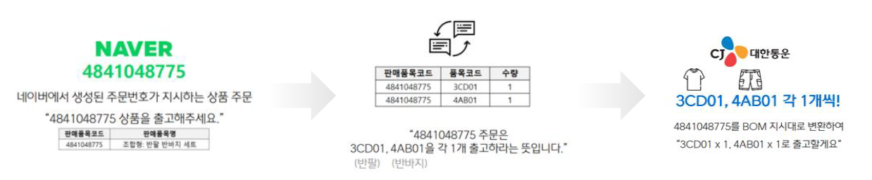 BOM이란 각 채널의 상품 판매페이지 주문내역을 풀필먼트에 동일하게 설정하여, 정상적으로 주문을 인입시키는 작업을 의미합니다.