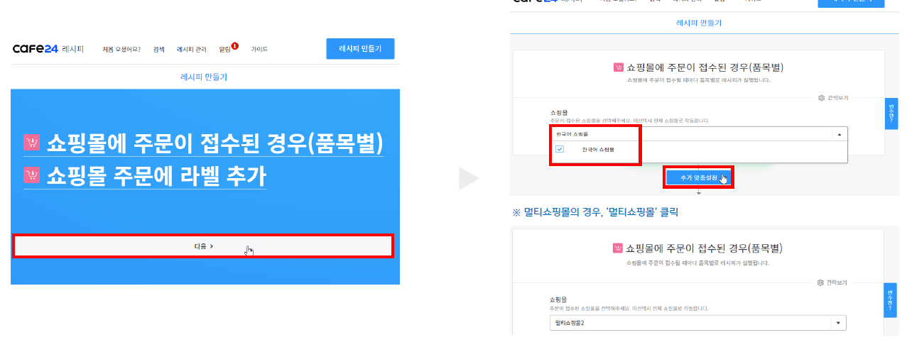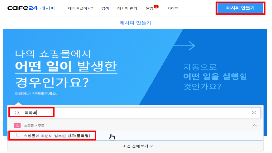 • '쇼핑몰에 주문이 접수된 경우(품목별)' 클릭
