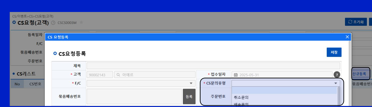 '신규등록 버튼' 클릭 후, CS 요청등록 팝업 창에서 'CS문의유형'을 선택 합니다.