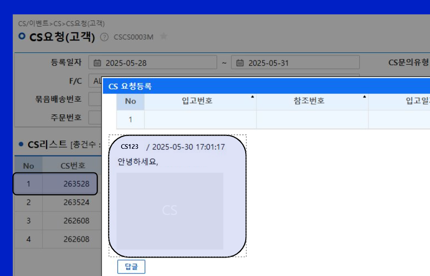 CS리스트의 개별 항목 선택 CS요청등록 팝업 하단 문의 상세답변을 확인할 수 있습니다.